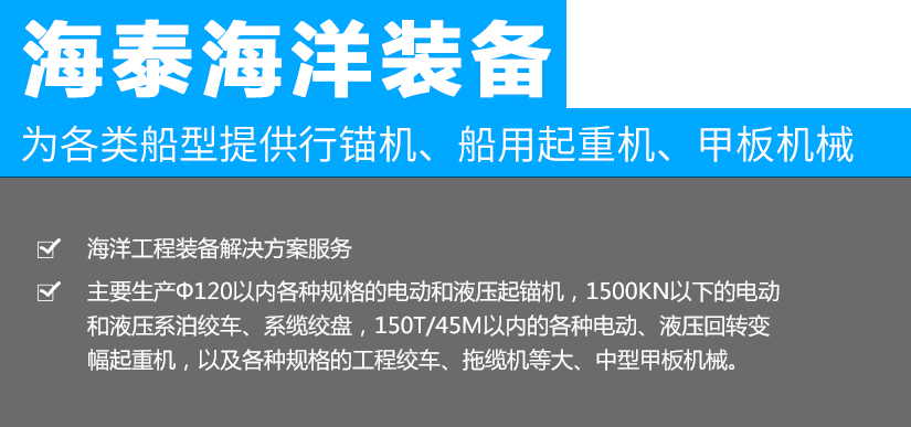 江蘇海泰海洋裝備有限公司位于素稱“銀杏之鄉(xiāng)”的泰興市,2018年投資建設,至今已經(jīng)成為產(chǎn)品研發(fā)、生產(chǎn)制造,調(diào)試服務為一體的設備配套企業(yè)。公司從事海洋裝備(設備)及配件的制造、設計、安裝,維修;船用錨機、絞車、起重機、舾裝件、電氣設備、環(huán)保設備設計、制造。公司成立以來,就與中國船舶工業(yè)集團公司第701所、702所、704所、708所、上海船舶研究設計院等多家船舶科研院所建立了技術合作關系,產(chǎn)品應用于......